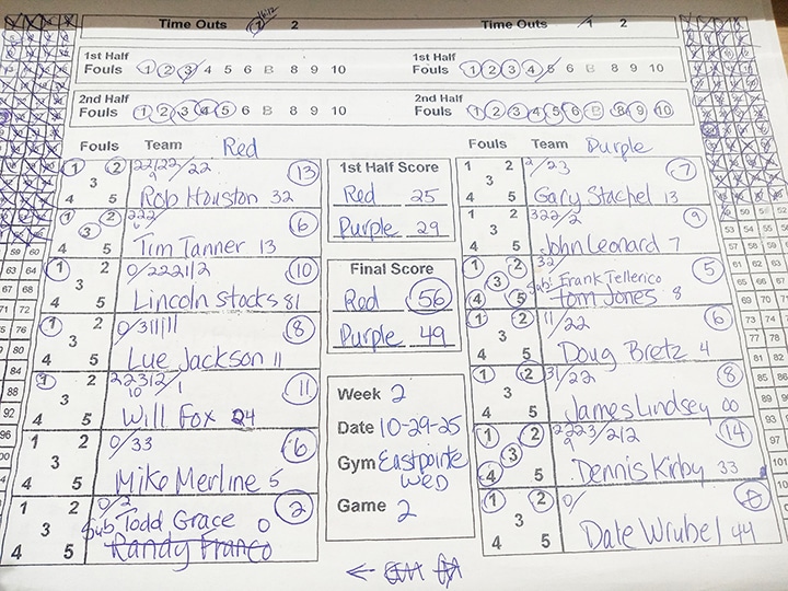 GAME A {scrimmage} — Purple 63, Red 52 (scorebook)